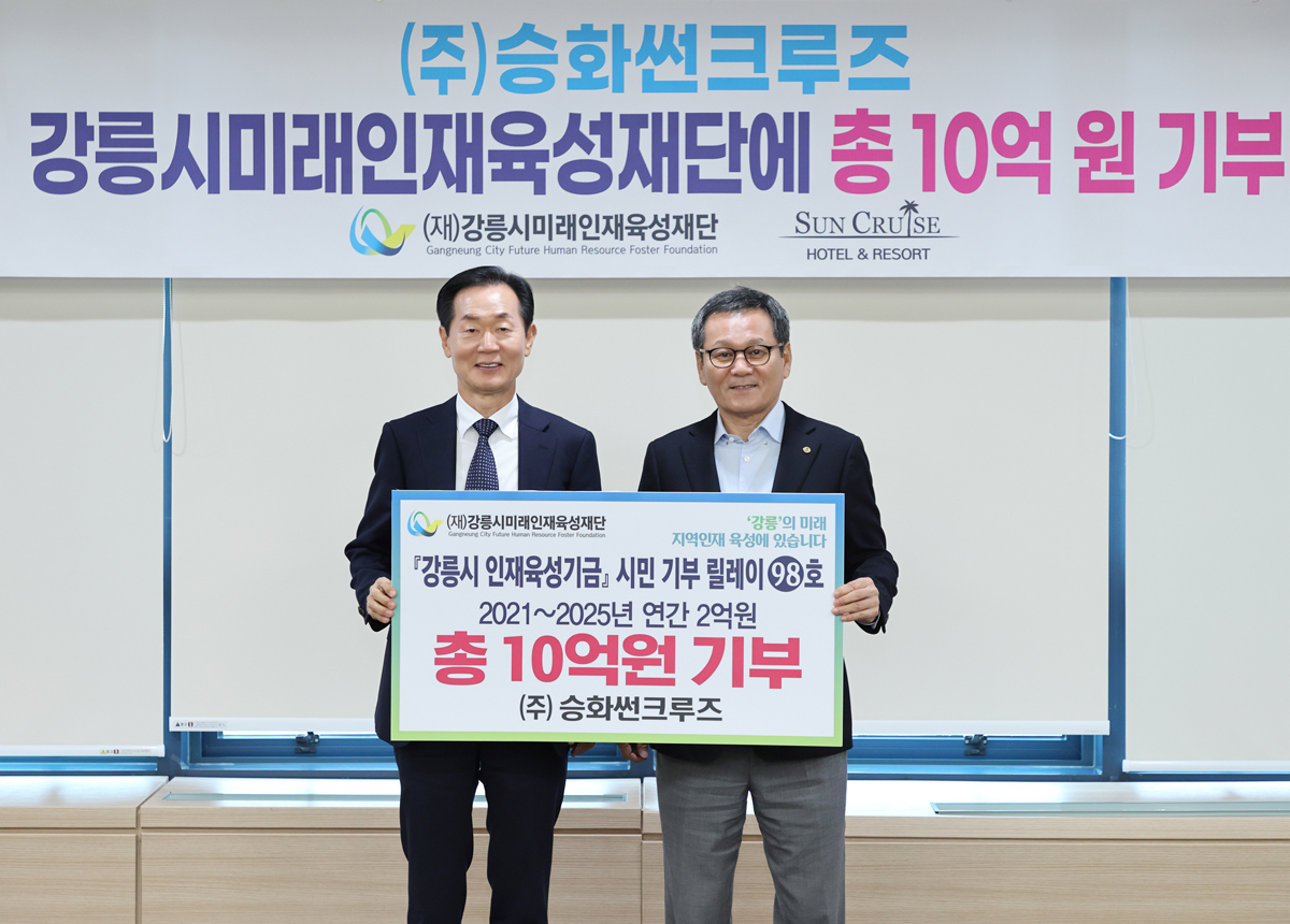 작성일 2025.10.21, 조회수 21 강릉시미래인재육성재단 기부릴레이 제98호 사진 확대보기 사진 확대보기 이전 이미지 보기 다음 이미지 보기 이전 썸네일 보기 다음 썸네일 보기 김홍규 시장은 21일 오후 8층 시민사랑방에서 열린 강릉시미래인재육성재단 기부릴레이 제98호((주)승화썬크루즈) 기탁식에 참석했다. 목록