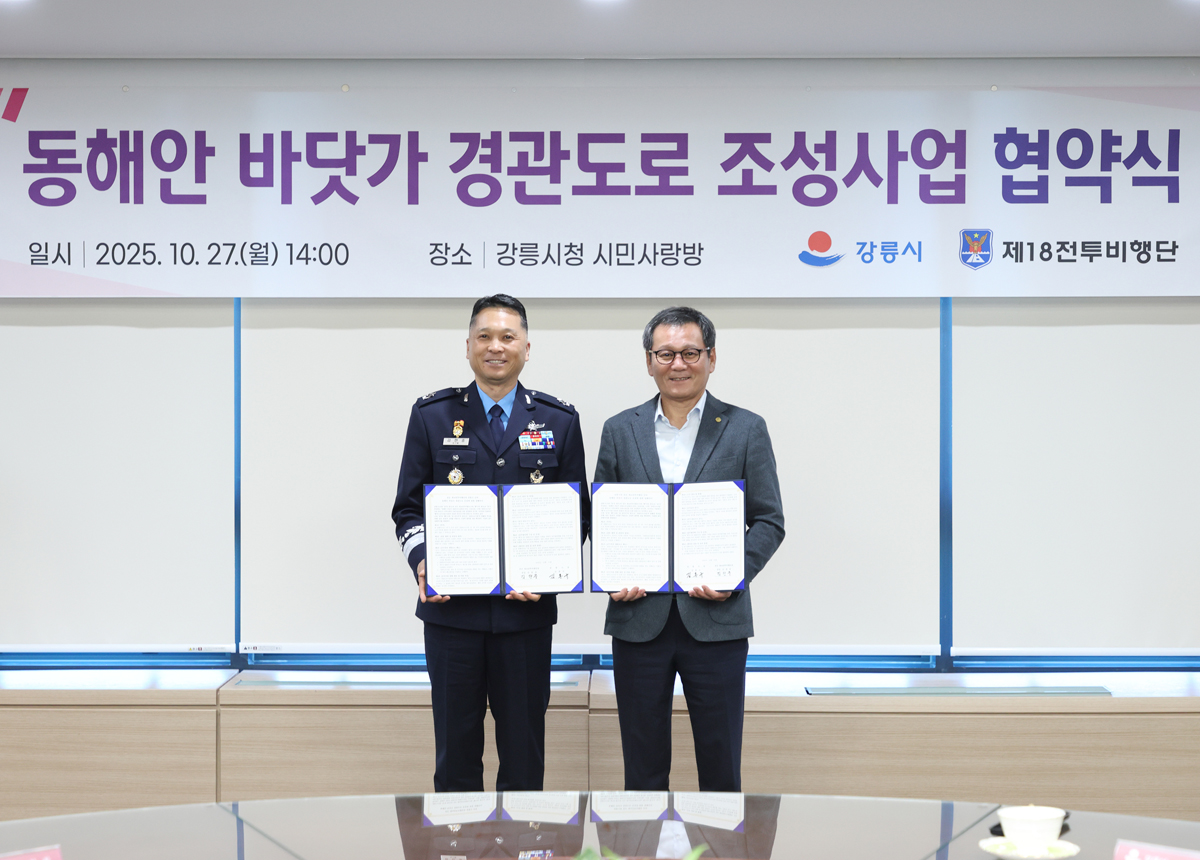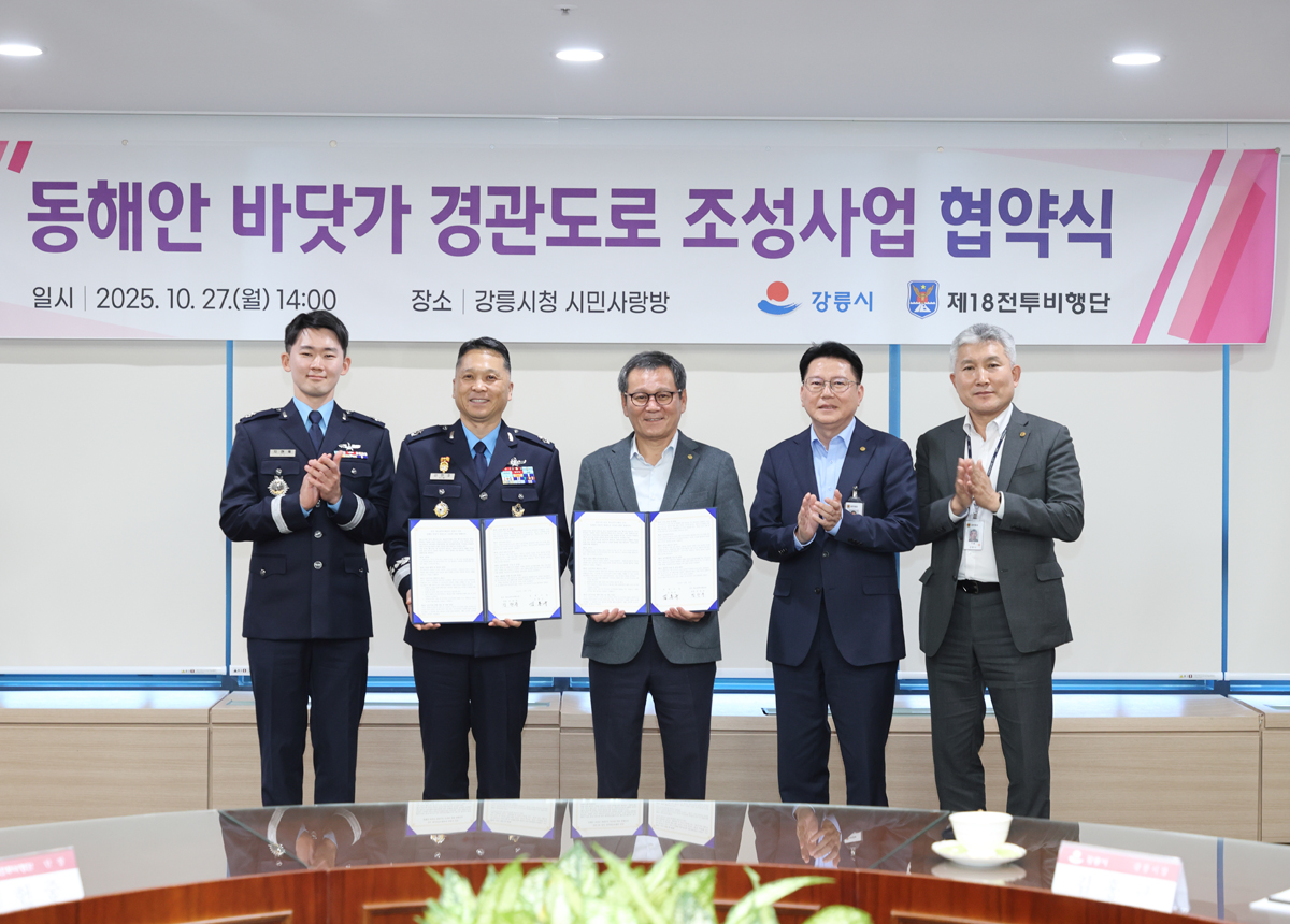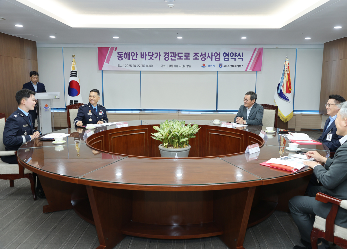 작성일 2025.10.27, 조회수 67 동해안 바닷가 경관도로(남항진~안인) 조성사업 업무협약 사진 확대보기 사진 확대보기 사진 확대보기 사진 확대보기 사진 확대보기 이전 이미지 보기 다음 이미지 보기 이전 썸네일 보기 다음 썸네일 보기 김홍규 시장은 27일 오후 8층 시민사랑방에서 열린 동해안 바닷가 경관도로(남항진~안인) 조성사업 업무협약식에 참석했다. 목록