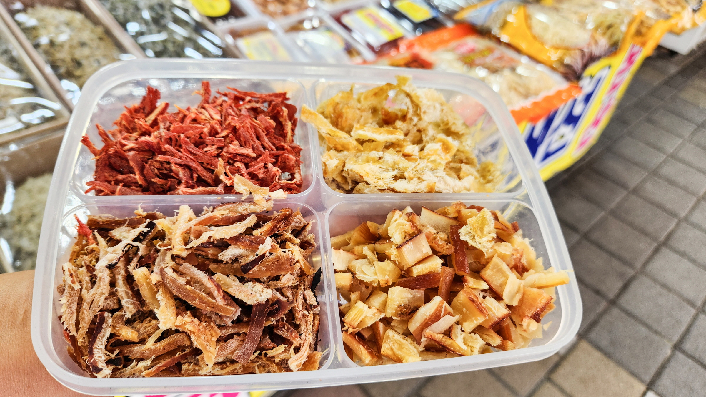 各店舗で出している試食の干物を食べてみて購入することができる。海の味を長く楽しむことができるため、干しイカやさきいか、干しエビ、干しスケトウダラ、昆布の素揚げなどはお土産にもぴったり。