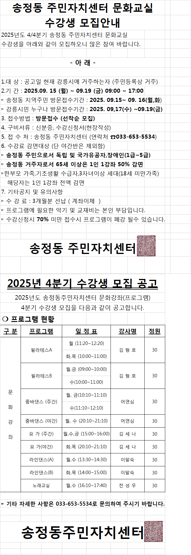 | 제목 | 2025년 4분기 송정동 주민자치센터 문화교실 수강생 모집 안내 |