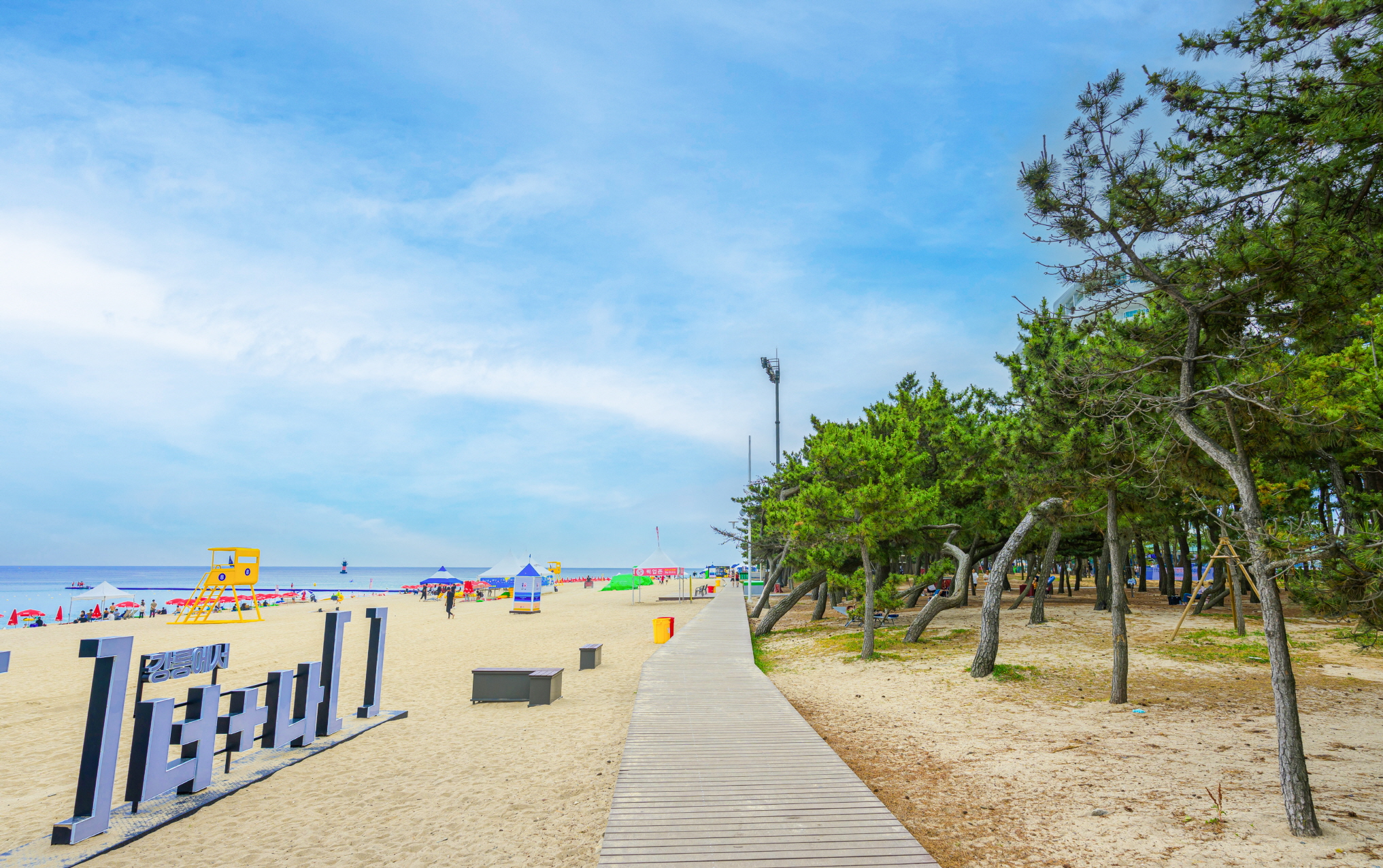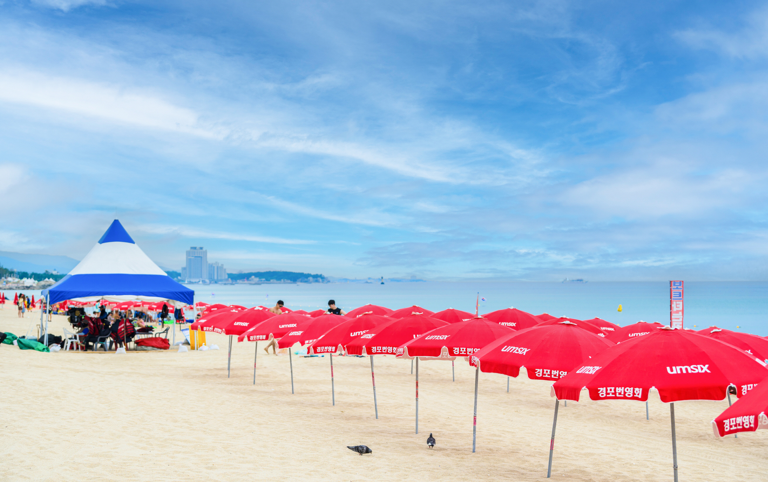 鏡浦海辺は江陵最大の海水浴場で、どこまでも広がる砂浜とそれを囲む緑豊かな松林が清涼感を与えてくれる。海辺を訪れる観光客を魅了するのは、自然の美しさだけではない。鏡浦海辺は海開きシーズン限定のアクティビティも充実している。