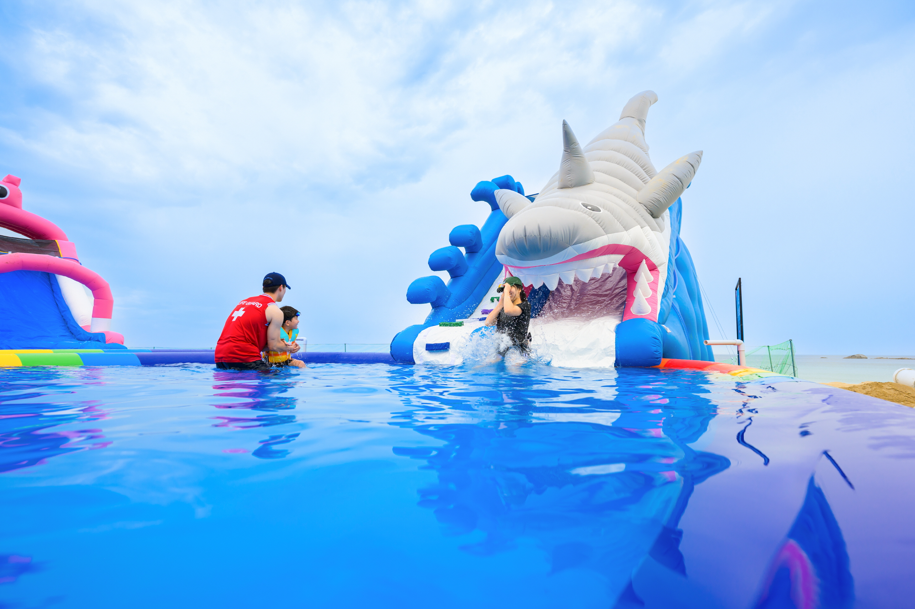 子どもと一緒に楽しめる水遊び場では、組み立て式プールと大型ウォータースライドを無料で利用できる。