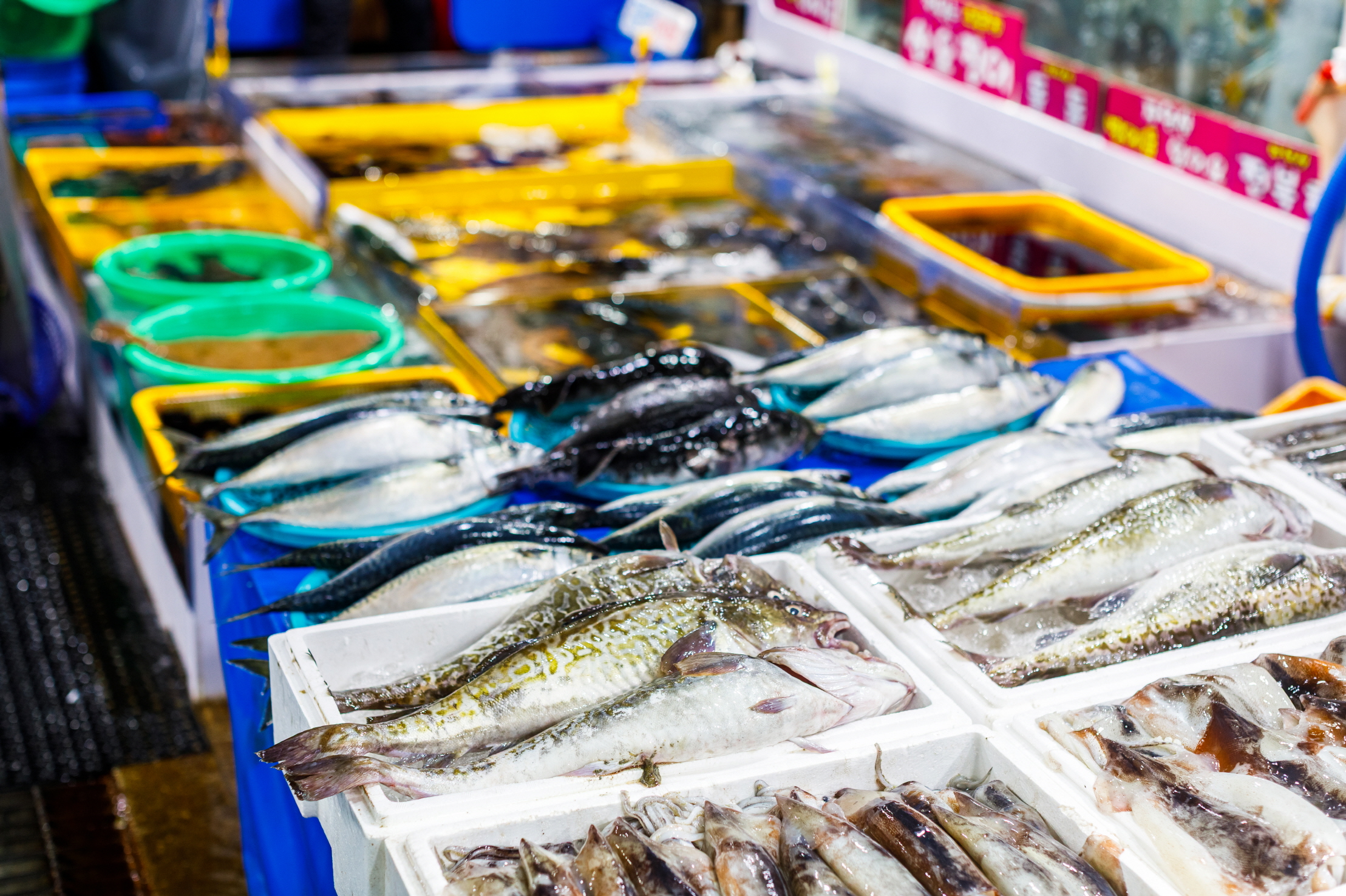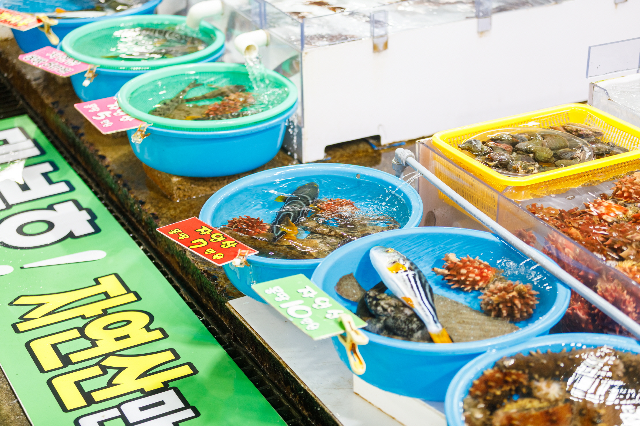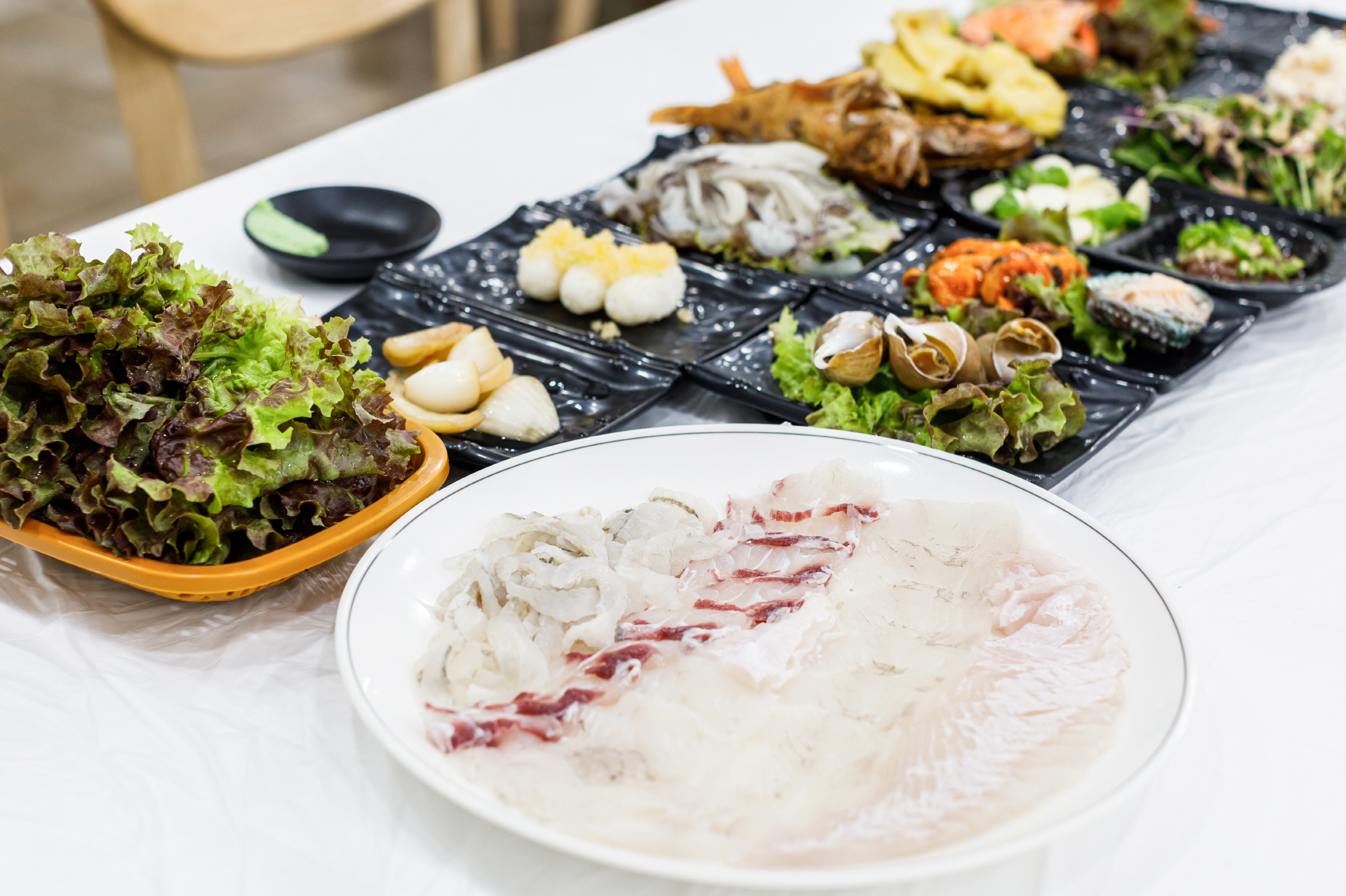 場内の刺身屋で刺し身の盛り合わせを頼むと刺し身のほか、色々な魚介料理や小皿のおかずがたくさんついてくる。お店によって異なるが、注文津でよく獲れるイカやホヤ、ナマコなど、さまざまな魚介類を楽しむことができる。刺し身を食べ終わる頃、刺し身の残りで作った辛い海鮮鍋「メウンタン」が出てくる。ご飯と一緒に食べれば完璧な食事となる。