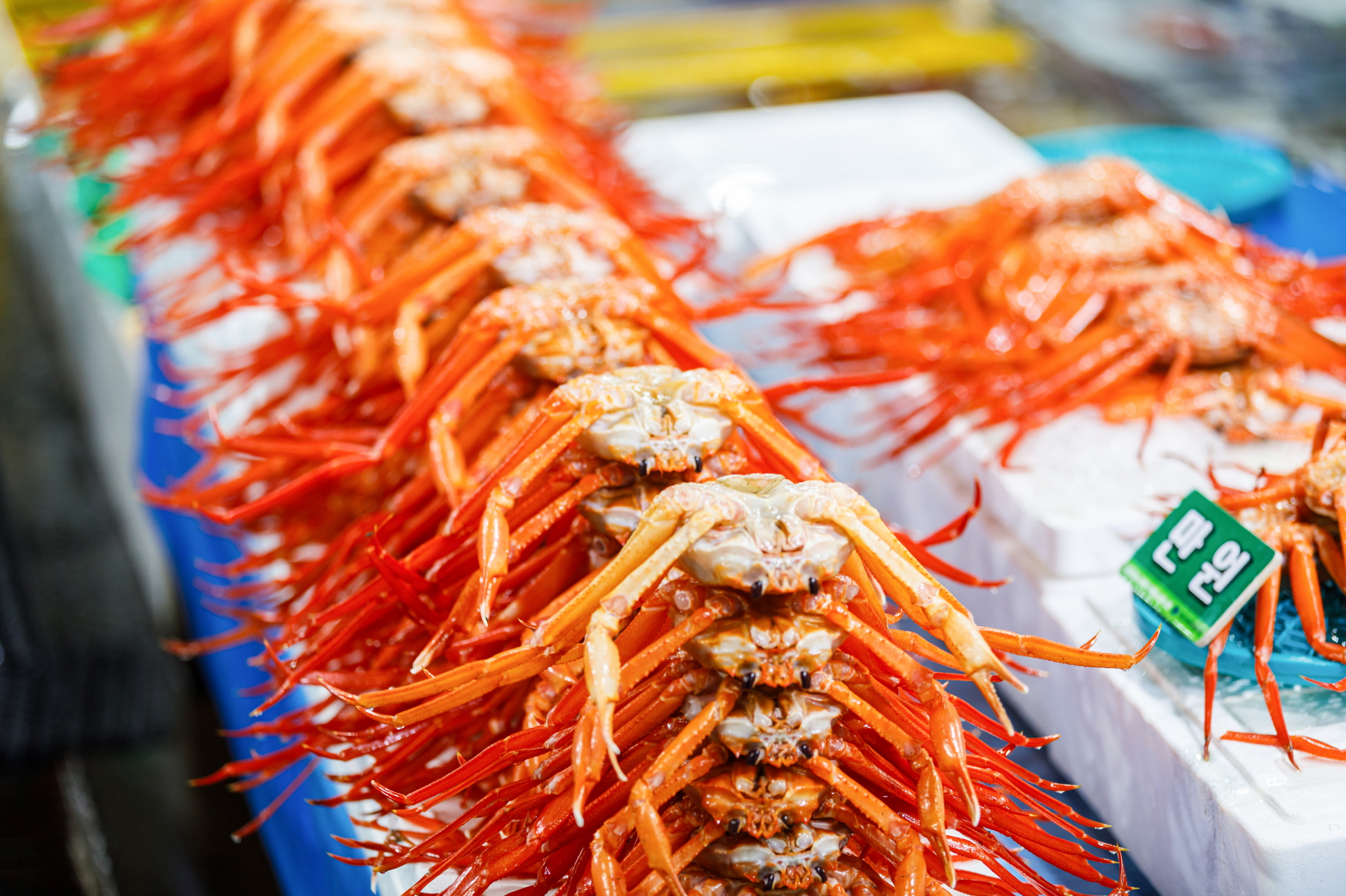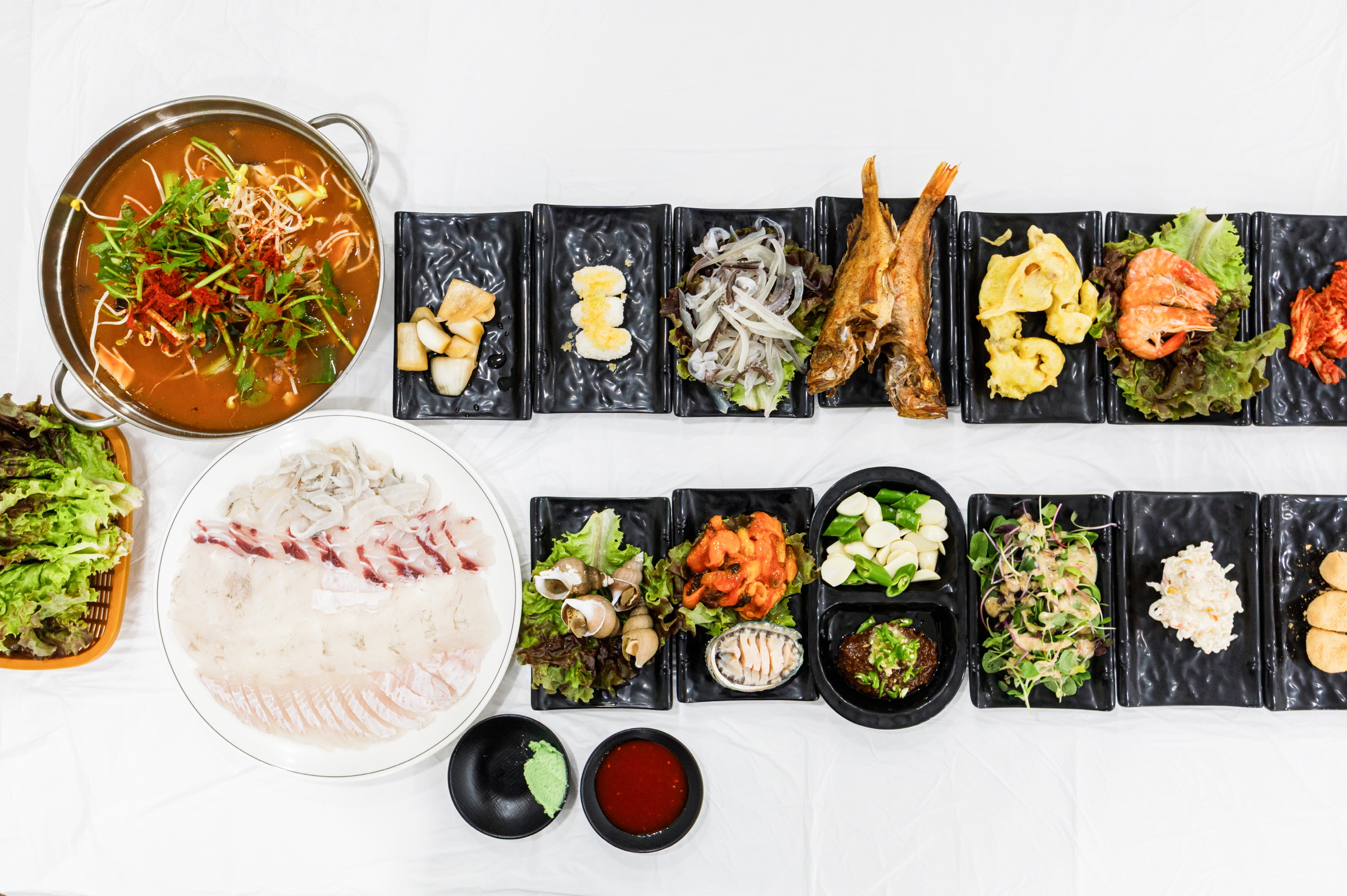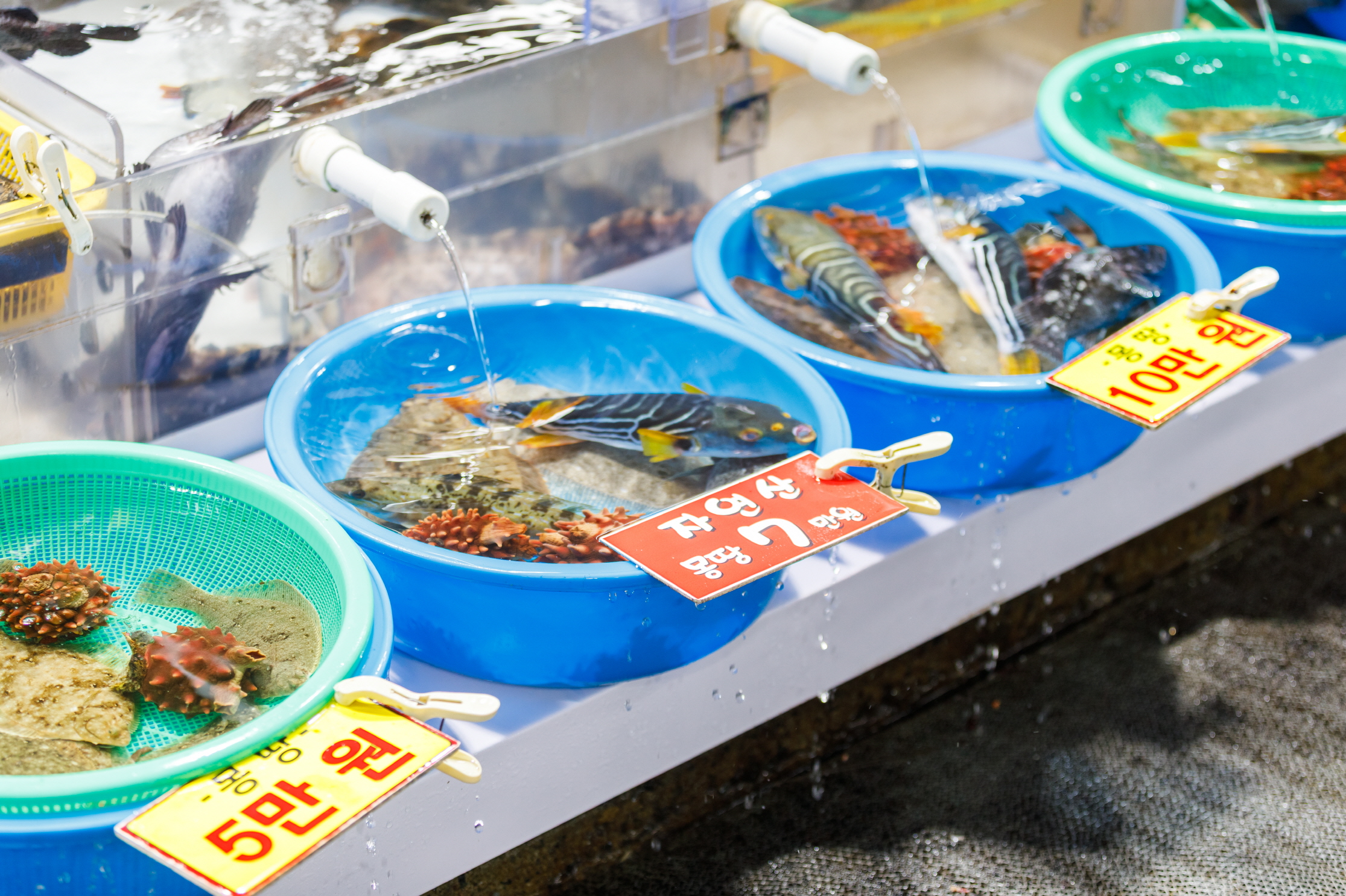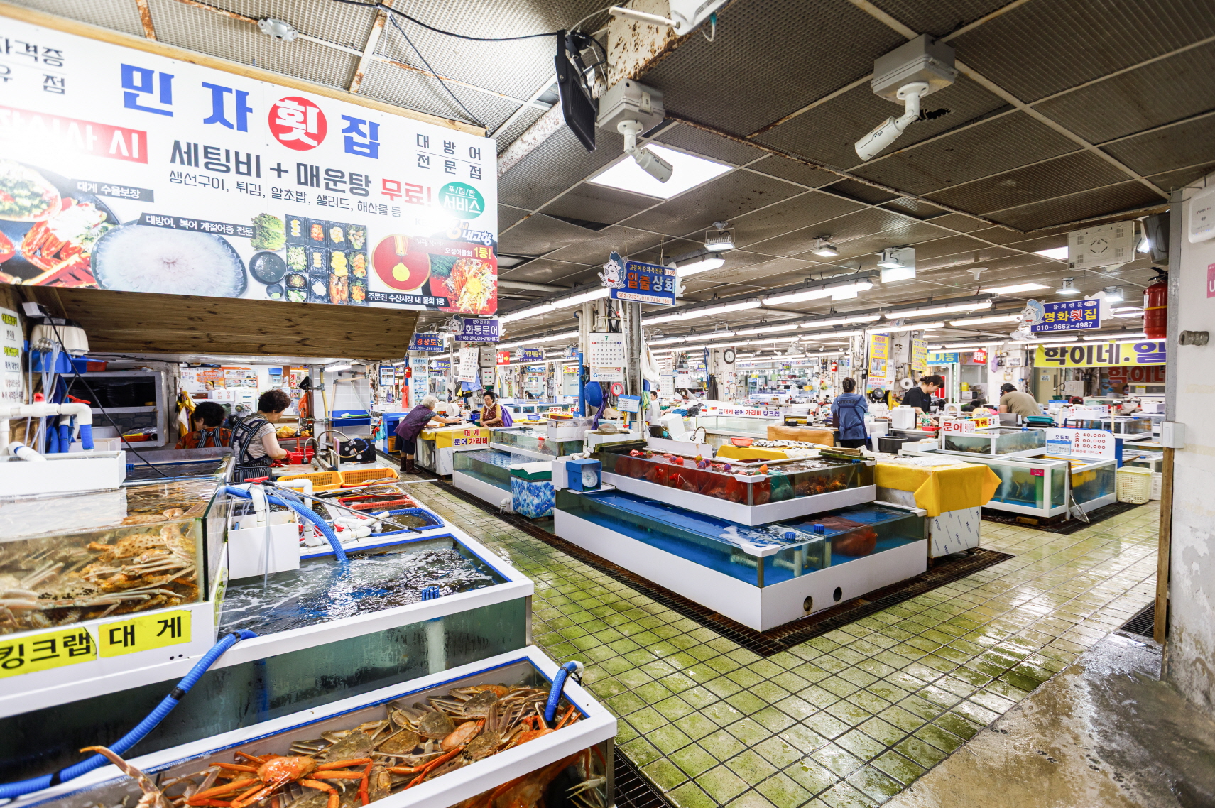 場内の刺身屋で刺し身の盛り合わせを頼むと刺し身のほか、色々な魚介料理や小皿のおかずがたくさんついてくる。お店によって異なるが、注文津でよく獲れるイカやホヤ、ナマコなど、さまざまな魚介類を楽しむことができる。刺し身を食べ終わる頃、刺し身の残りで作った辛い海鮮鍋「メウンタン」が出てくる。ご飯と一緒に食べれば完璧な食事となる。