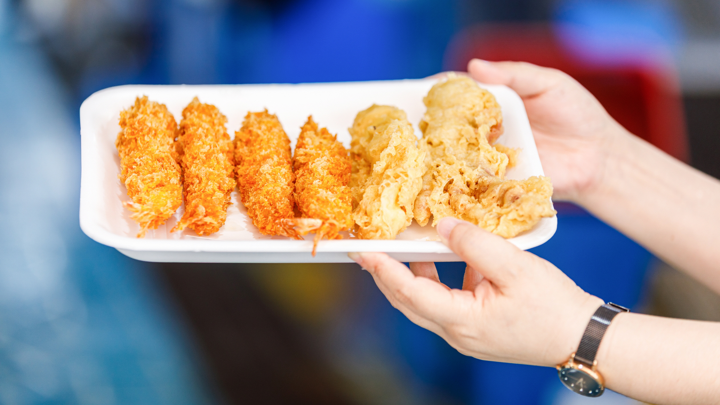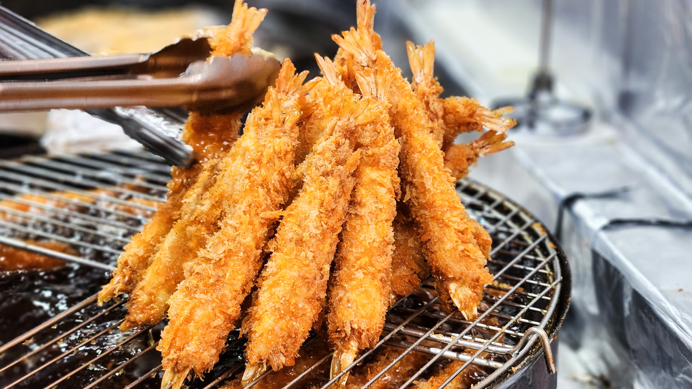 場内のあちこちには魚介類をその場で揚げてくれるお店がある。揚げたてのイカやエビの天ぷらは、外はサクサク、中はジューシーで美味しいし、一つ二つで満腹になるほど大きい。特に市場の裏口側にある「おばあさんの天ぷら」が有名だ。