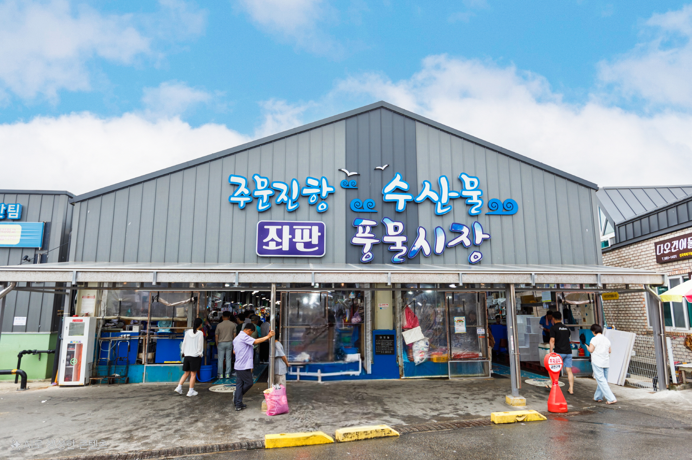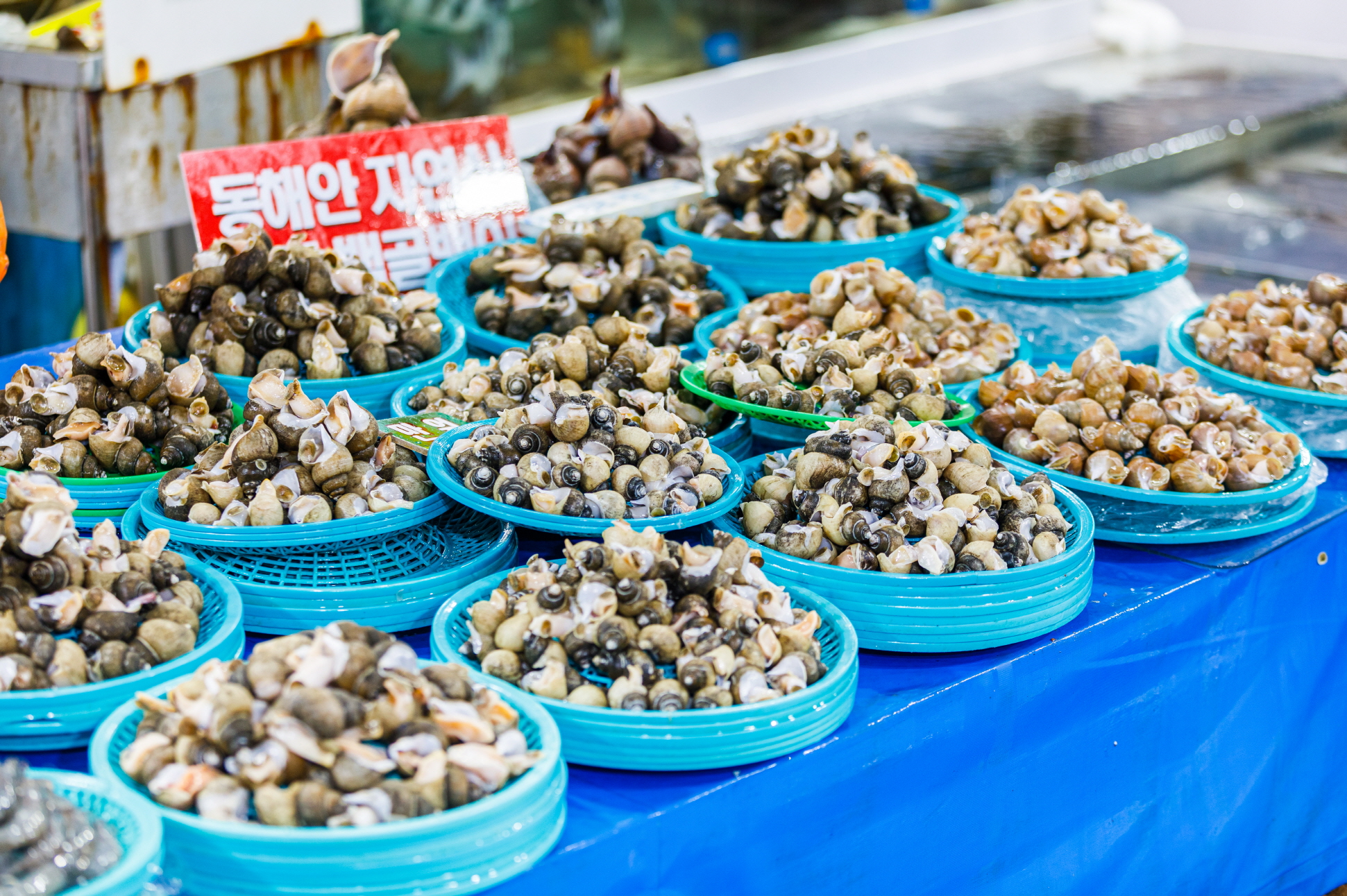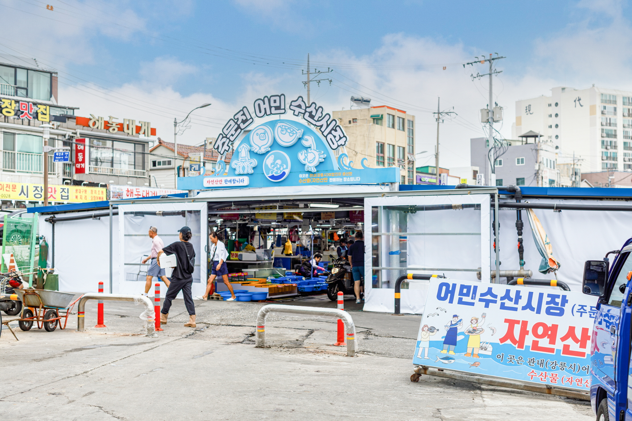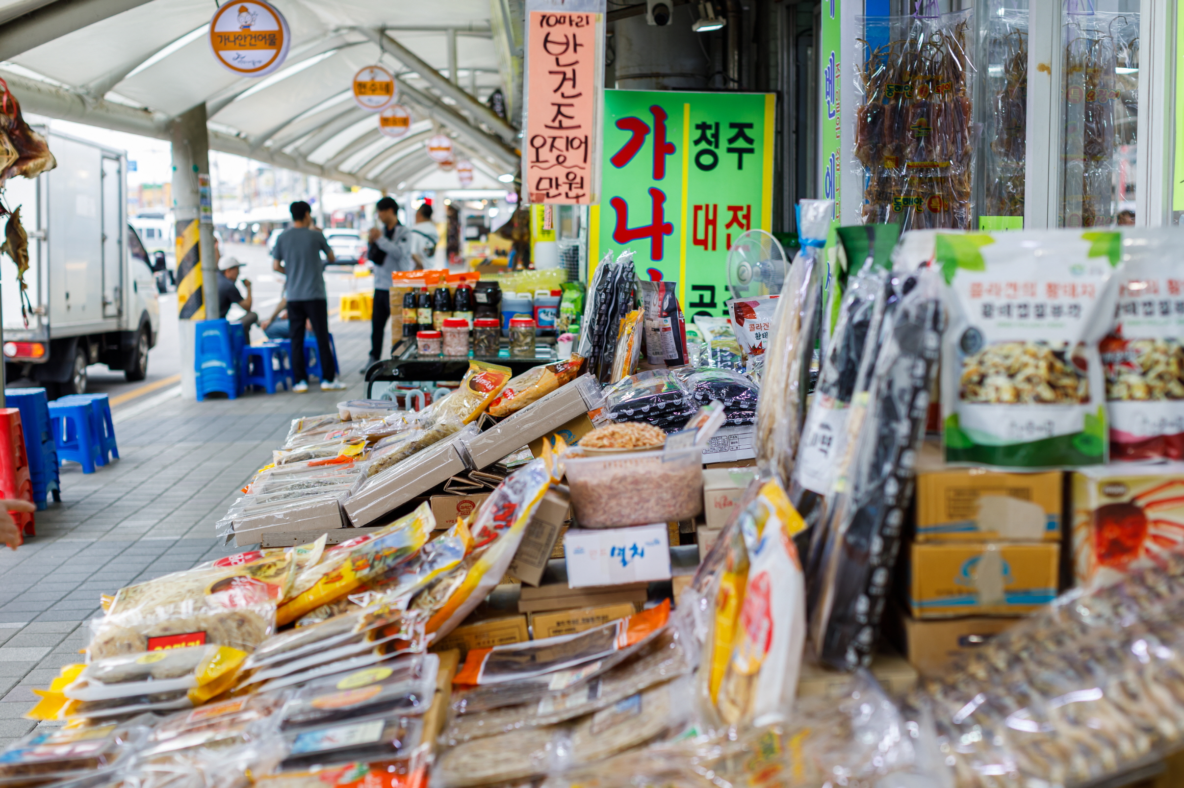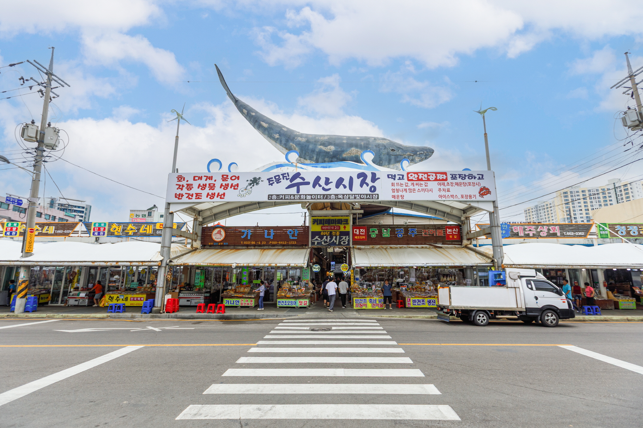 注文津水産市場は常設市場で、魚介類を専門に取り扱っている。注文津邑内の海岸道路の方へ行くと、ユニークなクジラのオブジェが見える。そこが市場の入り口で、場内には約80店舗が軒を連ねている。刺し身や魚介類、塩辛、干物など多彩な海の幸を販売している。
