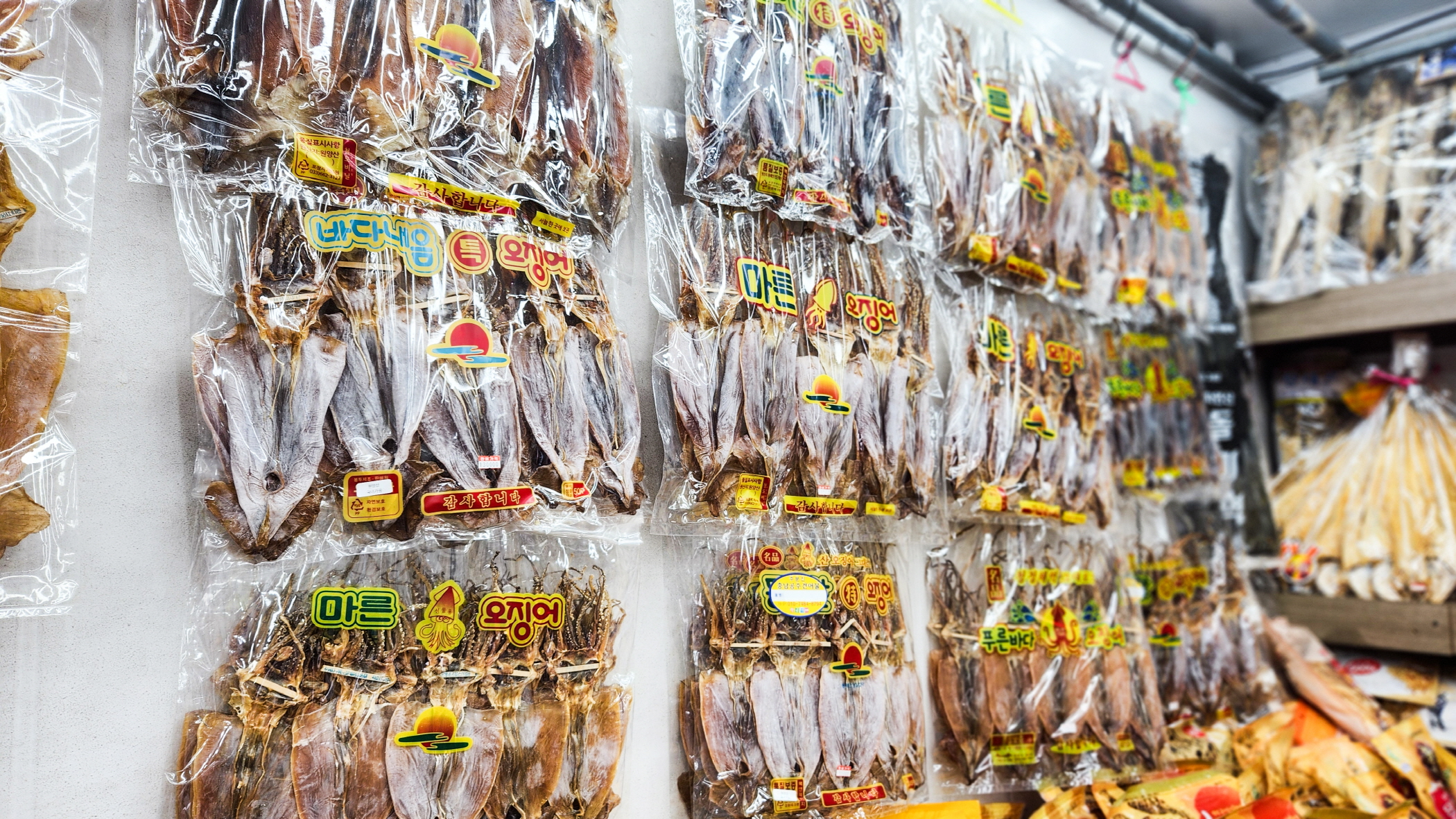 各店舗で出している試食の干物を食べてみて購入することができる。海の味を長く楽しむことができるため、干しイカやさきいか、干しエビ、干しスケトウダラ、昆布の素揚げなどはお土産にもぴったり。