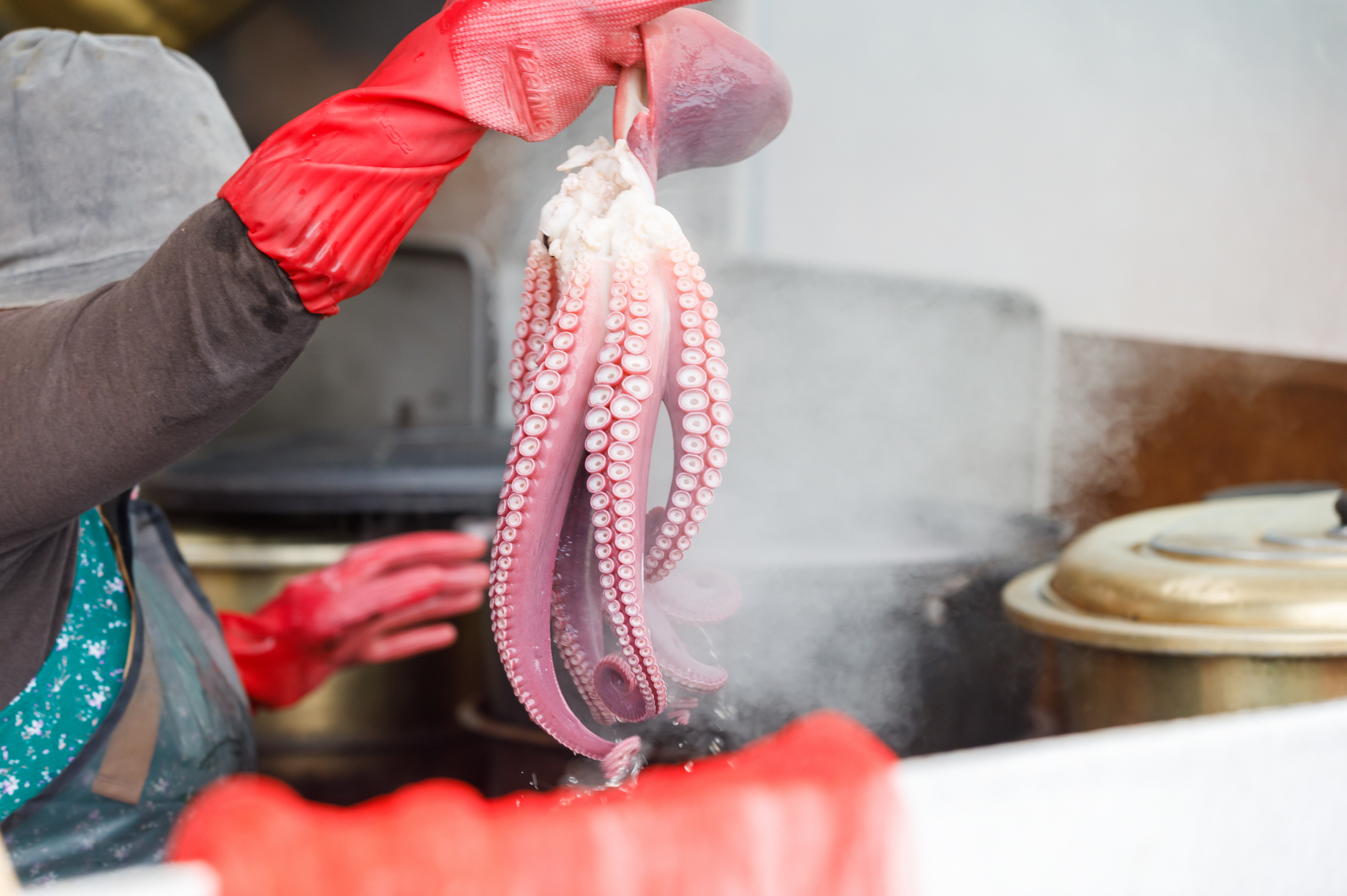 市場で購入したタコやベニズワイガニは、料金を支払うとその場で煮たり蒸したりしてくれる。漁師さんがその日水揚げした新鮮な魚介類など、注文津でしか味わえない旬の海の幸を堪能できる。