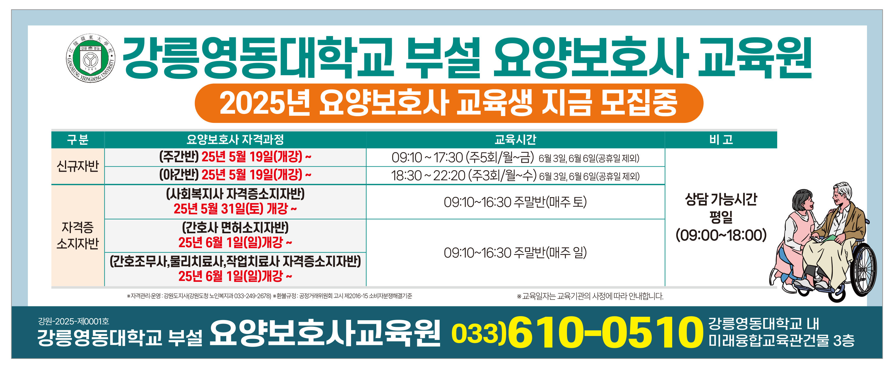 | 내용 | 강릉영동대학교 부설 요양보호사 교육원 2025년 요양보호사 교육생 모집 |