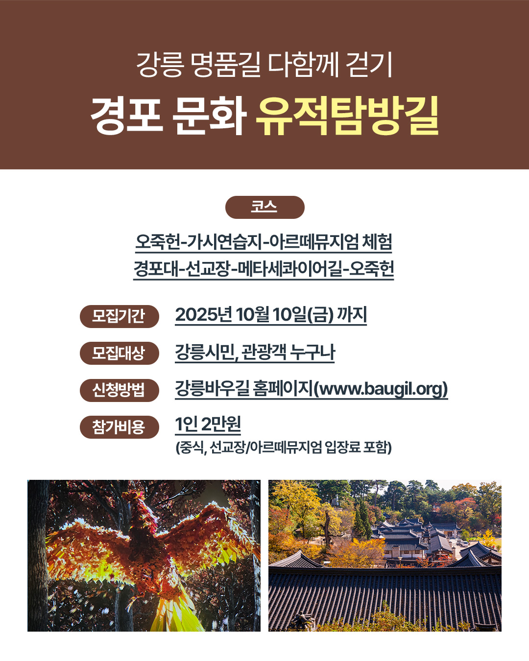 전문해설사와 함께 지역 문화와 자연 그리고 사람들을 만나며 걷기 좋은, 관광하기 좋은 강릉 명품길을 걷는 행사에 많은 관심과 참여 부탁 드립니다! - 일시: 2025. 10.15.(수) 10:00~16:00 - 대상: 강릉시민, 관광객 누구나 - 장소: 강릉 명품길 “경포문화유적탐방길” - 참가신청: 강릉 바우길 홈페이지 공지 게시판 경유(www.baugil.org ) - 행사내용: 상세 공고 참고 - 문의: 강릉 걷는 길 안내센터 033-645-0990 (09:00~12:00, 13:00~18:00 월요일 휴관) |